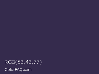 RGB 53,43,77 Color is a dark indigo color and the nearest color is Martinique #363050. Hex code #352b4d and RGB value is rgb(53,43,77). In RGB color space, this color is composed of 21% red, 17% green, 30% blue, In CMYK color space, this color is composed of 31% cyan, 44% magenta, 0% yellow , 70% black , In HSL color space, this color has a hue angle of 258° , 28% saturation and 24% lightness.