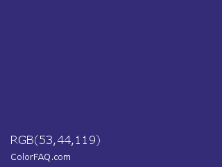 RGB 53,44,119 Color is a normal indigo color and the nearest color is Minsk #3f307f. Hex code #352c77 and RGB value is rgb(53,44,119). In RGB color space, this color is composed of 21% red, 17% green, 47% blue, In CMYK color space, this color is composed of 55% cyan, 63% magenta, 0% yellow , 53% black , In HSL color space, this color has a hue angle of 247° , 46% saturation and 32% lightness.