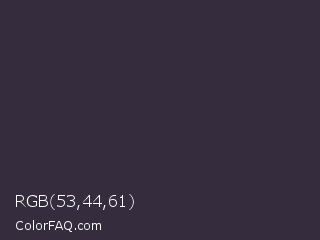 RGB 53,44,61 Color is a very dark purple color and the nearest color is Blackcurrant #32293a. Hex code #352c3d and RGB value is rgb(53,44,61). In RGB color space, this color is composed of 21% red, 17% green, 24% blue, In CMYK color space, this color is composed of 13% cyan, 28% magenta, 0% yellow , 76% black , In HSL color space, this color has a hue angle of 272° , 16% saturation and 21% lightness.