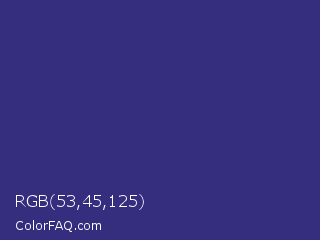 RGB 53,45,125 Color is a normal indigo color and the nearest color is Minsk #3f307f. Hex code #352d7d and RGB value is rgb(53,45,125). In RGB color space, this color is composed of 21% red, 18% green, 49% blue, In CMYK color space, this color is composed of 58% cyan, 64% magenta, 0% yellow , 51% black , In HSL color space, this color has a hue angle of 246° , 47% saturation and 33% lightness.