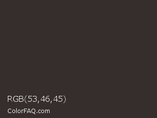 RGB 53,46,45 Color is a very dark red color and the nearest color is Thunder #33292f. Hex code #352e2d and RGB value is rgb(53,46,45). In RGB color space, this color is composed of 21% red, 18% green, 18% blue, In CMYK color space, this color is composed of 0% cyan, 13% magenta, 15% yellow , 79% black , In HSL color space, this color has a hue angle of 7° , 8% saturation and 19% lightness.