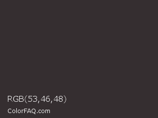 RGB 53,46,48 Color is a very dark rose color and the nearest color is Mine Shaft #323232. Hex code #352e30 and RGB value is rgb(53,46,48). In RGB color space, this color is composed of 21% red, 18% green, 19% blue, In CMYK color space, this color is composed of 0% cyan, 13% magenta, 9% yellow , 79% black , In HSL color space, this color has a hue angle of 343° , 7% saturation and 19% lightness.