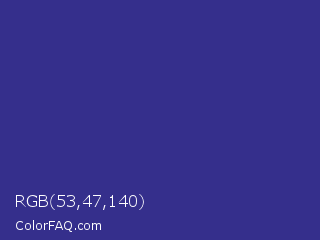 RGB 53,47,140 Color is a normal indigo color and the nearest color is Cosmic Cobalt #2e2d88. Hex code #352f8c and RGB value is rgb(53,47,140). In RGB color space, this color is composed of 21% red, 18% green, 55% blue, In CMYK color space, this color is composed of 62% cyan, 66% magenta, 0% yellow , 45% black , In HSL color space, this color has a hue angle of 244° , 50% saturation and 37% lightness.