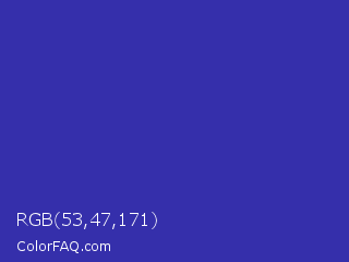 RGB 53,47,171 Color is a normal indigo color and the nearest color is Governor Bay #2f3cb3. Hex code #352fab and RGB value is rgb(53,47,171). In RGB color space, this color is composed of 21% red, 18% green, 67% blue, In CMYK color space, this color is composed of 69% cyan, 73% magenta, 0% yellow , 33% black , In HSL color space, this color has a hue angle of 243° , 57% saturation and 43% lightness.