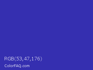RGB 53,47,176 Color is a normal indigo color and the nearest color is Governor Bay #2f3cb3. Hex code #352fb0 and RGB value is rgb(53,47,176). In RGB color space, this color is composed of 21% red, 18% green, 69% blue, In CMYK color space, this color is composed of 70% cyan, 73% magenta, 0% yellow , 31% black , In HSL color space, this color has a hue angle of 243° , 58% saturation and 44% lightness.