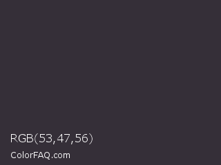 RGB 53,47,56 Color is a very dark purple color and the nearest color is Jet #343434. Hex code #352f38 and RGB value is rgb(53,47,56). In RGB color space, this color is composed of 21% red, 18% green, 22% blue, In CMYK color space, this color is composed of 5% cyan, 16% magenta, 0% yellow , 78% black , In HSL color space, this color has a hue angle of 280° , 9% saturation and 20% lightness.