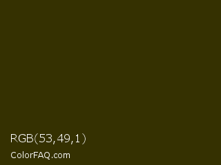 RGB 53,49,1 Color is a very dark yellow color and the nearest color is Madras #3f3002. Hex code #353101 and RGB value is rgb(53,49,1). In RGB color space, this color is composed of 21% red, 19% green, 0% blue, In CMYK color space, this color is composed of 0% cyan, 8% magenta, 98% yellow , 79% black , In HSL color space, this color has a hue angle of 55° , 96% saturation and 11% lightness.