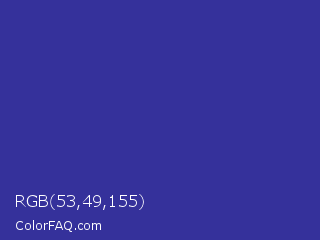 RGB 53,49,155 Color is a normal indigo color and the nearest color is Blue Pigment #333399. Hex code #35319b and RGB value is rgb(53,49,155). In RGB color space, this color is composed of 21% red, 19% green, 61% blue, In CMYK color space, this color is composed of 66% cyan, 68% magenta, 0% yellow , 39% black , In HSL color space, this color has a hue angle of 242° , 52% saturation and 40% lightness.