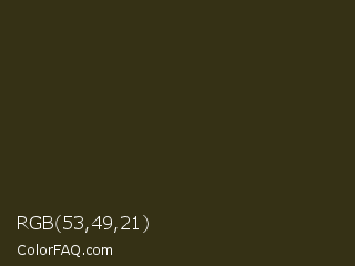RGB 53,49,21 Color is a very dark yellow color and the nearest color is Pullman Green #3b331c. Hex code #353115 and RGB value is rgb(53,49,21). In RGB color space, this color is composed of 21% red, 19% green, 8% blue, In CMYK color space, this color is composed of 0% cyan, 8% magenta, 60% yellow , 79% black , In HSL color space, this color has a hue angle of 53° , 43% saturation and 15% lightness.