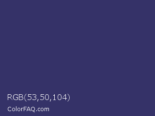 RGB 53,50,104 Color is a dark indigo color and the nearest color is Deep Koamaru #333366. Hex code #353268 and RGB value is rgb(53,50,104). In RGB color space, this color is composed of 21% red, 20% green, 41% blue, In CMYK color space, this color is composed of 49% cyan, 52% magenta, 0% yellow , 59% black , In HSL color space, this color has a hue angle of 243° , 35% saturation and 30% lightness.