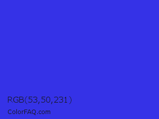 RGB 53,50,231 Color is a normal indigo color and the nearest color is Palatinate Blue #273be2. Hex code #3532e7 and RGB value is rgb(53,50,231). In RGB color space, this color is composed of 21% red, 20% green, 91% blue, In CMYK color space, this color is composed of 77% cyan, 78% magenta, 0% yellow , 9% black , In HSL color space, this color has a hue angle of 241° , 79% saturation and 55% lightness.