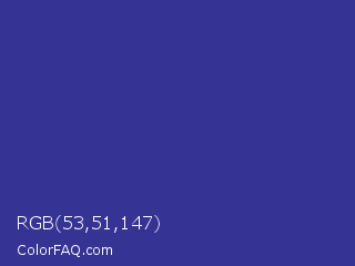 RGB 53,51,147 Color is a normal indigo color and the nearest color is Blue Pigment #333399. Hex code #353393 and RGB value is rgb(53,51,147). In RGB color space, this color is composed of 21% red, 20% green, 58% blue, In CMYK color space, this color is composed of 64% cyan, 65% magenta, 0% yellow , 42% black , In HSL color space, this color has a hue angle of 241° , 48% saturation and 39% lightness.