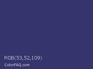 RGB 53,52,109 Color is a normal indigo color and the nearest color is Deep Koamaru #333366. Hex code #35346d and RGB value is rgb(53,52,109). In RGB color space, this color is composed of 21% red, 20% green, 43% blue, In CMYK color space, this color is composed of 51% cyan, 52% magenta, 0% yellow , 57% black , In HSL color space, this color has a hue angle of 241° , 35% saturation and 32% lightness.