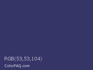 RGB 53,53,104 Color is a normal blue color and the nearest color is Deep Koamaru #333366. Hex code #353568 and RGB value is rgb(53,53,104). In RGB color space, this color is composed of 21% red, 21% green, 41% blue, In CMYK color space, this color is composed of 49% cyan, 49% magenta, 0% yellow , 59% black , In HSL color space, this color has a hue angle of 240° , 32% saturation and 31% lightness.