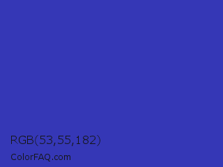 RGB 53,55,182 Color is a normal blue color and the nearest color is Governor Bay #2f3cb3. Hex code #3537b6 and RGB value is rgb(53,55,182). In RGB color space, this color is composed of 21% red, 22% green, 71% blue, In CMYK color space, this color is composed of 71% cyan, 70% magenta, 0% yellow , 29% black , In HSL color space, this color has a hue angle of 239° , 55% saturation and 46% lightness.
