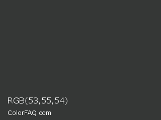 RGB 53,55,54 Color is a very dark green color and the nearest color is Tuatara #363534. Hex code #353736 and RGB value is rgb(53,55,54). In RGB color space, this color is composed of 21% red, 22% green, 21% blue, In CMYK color space, this color is composed of 4% cyan, 0% magenta, 2% yellow , 78% black , In HSL color space, this color has a hue angle of 150° , 2% saturation and 21% lightness.