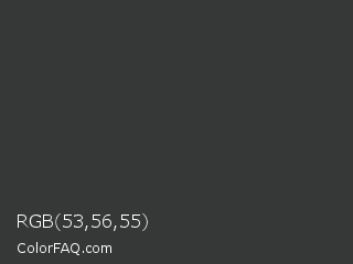 RGB 53,56,55 Color is a very dark green color and the nearest color is Onyx #353839. Hex code #353837 and RGB value is rgb(53,56,55). In RGB color space, this color is composed of 21% red, 22% green, 22% blue, In CMYK color space, this color is composed of 5% cyan, 0% magenta, 2% yellow , 78% black , In HSL color space, this color has a hue angle of 160° , 3% saturation and 21% lightness.