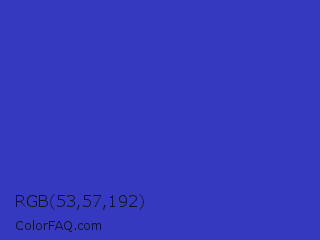 RGB 53,57,192 Color is a normal blue color and the nearest color is Governor Bay #2f3cb3. Hex code #3539c0 and RGB value is rgb(53,57,192). In RGB color space, this color is composed of 21% red, 22% green, 75% blue, In CMYK color space, this color is composed of 72% cyan, 70% magenta, 0% yellow , 25% black , In HSL color space, this color has a hue angle of 238° , 57% saturation and 48% lightness.