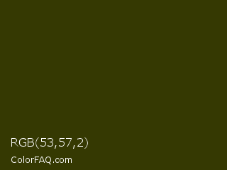 RGB 53,57,2 Color is a very dark yellow color and the nearest color is Waiouru #363c0d. Hex code #353902 and RGB value is rgb(53,57,2). In RGB color space, this color is composed of 21% red, 22% green, 1% blue, In CMYK color space, this color is composed of 7% cyan, 0% magenta, 96% yellow , 78% black , In HSL color space, this color has a hue angle of 64° , 93% saturation and 12% lightness.