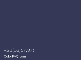 RGB 53,57,87 Color is a dark blue color and the nearest color is Martinique #363050. Hex code #353957 and RGB value is rgb(53,57,87). In RGB color space, this color is composed of 21% red, 22% green, 34% blue, In CMYK color space, this color is composed of 39% cyan, 34% magenta, 0% yellow , 66% black , In HSL color space, this color has a hue angle of 233° , 24% saturation and 27% lightness.