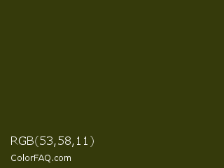 RGB 53,58,11 Color is a very dark yellow color and the nearest color is Waiouru #363c0d. Hex code #353a0b and RGB value is rgb(53,58,11). In RGB color space, this color is composed of 21% red, 23% green, 4% blue, In CMYK color space, this color is composed of 9% cyan, 0% magenta, 81% yellow , 77% black , In HSL color space, this color has a hue angle of 66° , 68% saturation and 14% lightness.
