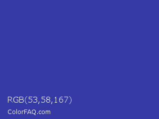 RGB 53,58,167 Color is a normal blue color and the nearest color is Governor Bay #2f3cb3. Hex code #353aa7 and RGB value is rgb(53,58,167). In RGB color space, this color is composed of 21% red, 23% green, 65% blue, In CMYK color space, this color is composed of 68% cyan, 65% magenta, 0% yellow , 35% black , In HSL color space, this color has a hue angle of 237° , 52% saturation and 43% lightness.