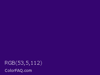 RGB 53,5,112 Color is a dark violet color and the nearest color is Blue Diamond #380474. Hex code #350570 and RGB value is rgb(53,5,112). In RGB color space, this color is composed of 21% red, 2% green, 44% blue, In CMYK color space, this color is composed of 53% cyan, 96% magenta, 0% yellow , 56% black , In HSL color space, this color has a hue angle of 267° , 91% saturation and 23% lightness.