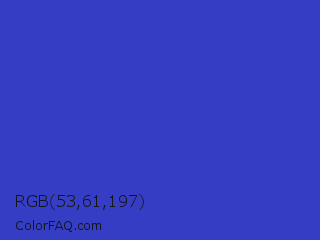 RGB 53,61,197 Color is a normal blue color and the nearest color is Governor Bay #2f3cb3. Hex code #353dc5 and RGB value is rgb(53,61,197). In RGB color space, this color is composed of 21% red, 24% green, 77% blue, In CMYK color space, this color is composed of 73% cyan, 69% magenta, 0% yellow , 23% black , In HSL color space, this color has a hue angle of 237° , 58% saturation and 49% lightness.