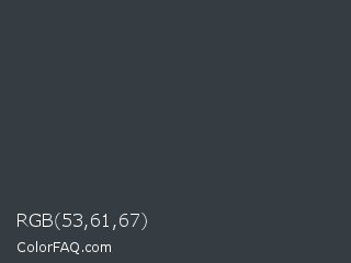 RGB 53,61,67 Color is a dark blue color and the nearest color is Tuna #353542. Hex code #353d43 and RGB value is rgb(53,61,67). In RGB color space, this color is composed of 21% red, 24% green, 26% blue, In CMYK color space, this color is composed of 21% cyan, 9% magenta, 0% yellow , 74% black , In HSL color space, this color has a hue angle of 206° , 12% saturation and 24% lightness.