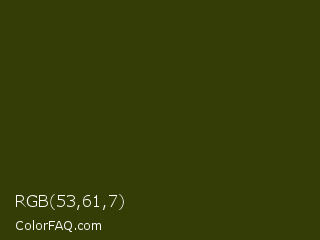 RGB 53,61,7 Color is a very dark yellow color and the nearest color is Waiouru #363c0d. Hex code #353d07 and RGB value is rgb(53,61,7). In RGB color space, this color is composed of 21% red, 24% green, 3% blue, In CMYK color space, this color is composed of 13% cyan, 0% magenta, 89% yellow , 76% black , In HSL color space, this color has a hue angle of 69° , 79% saturation and 13% lightness.