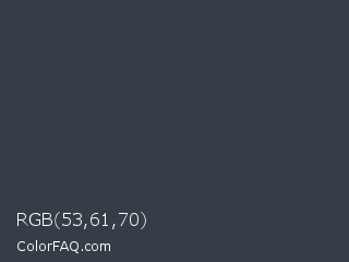 RGB 53,61,70 Color is a dark blue color and the nearest color is Tuna #353542. Hex code #353d46 and RGB value is rgb(53,61,70). In RGB color space, this color is composed of 21% red, 24% green, 27% blue, In CMYK color space, this color is composed of 24% cyan, 13% magenta, 0% yellow , 73% black , In HSL color space, this color has a hue angle of 212° , 14% saturation and 24% lightness.