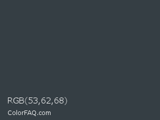 RGB 53,62,68 Color is a dark blue color and the nearest color is Tuna #353542. Hex code #353e44 and RGB value is rgb(53,62,68). In RGB color space, this color is composed of 21% red, 24% green, 27% blue, In CMYK color space, this color is composed of 22% cyan, 9% magenta, 0% yellow , 73% black , In HSL color space, this color has a hue angle of 204° , 12% saturation and 24% lightness.