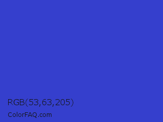 RGB 53,63,205 Color is a normal blue color and the nearest color is Palatinate Blue #273be2. Hex code #353fcd and RGB value is rgb(53,63,205). In RGB color space, this color is composed of 21% red, 25% green, 80% blue, In CMYK color space, this color is composed of 74% cyan, 69% magenta, 0% yellow , 20% black , In HSL color space, this color has a hue angle of 236° , 60% saturation and 51% lightness.