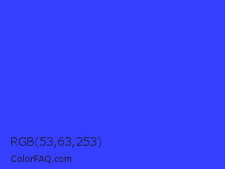 RGB 53,63,253 Color is a normal blue color and the nearest color is Palatinate Blue #273be2. Hex code #353ffd and RGB value is rgb(53,63,253). In RGB color space, this color is composed of 21% red, 25% green, 99% blue, In CMYK color space, this color is composed of 79% cyan, 75% magenta, 0% yellow , 1% black , In HSL color space, this color has a hue angle of 237° , 98% saturation and 60% lightness.