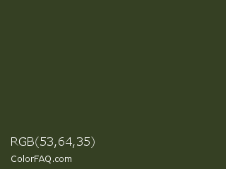 RGB 53,64,35 Color is a very dark green color and the nearest color is Kombu Green #354230. Hex code #354023 and RGB value is rgb(53,64,35). In RGB color space, this color is composed of 21% red, 25% green, 14% blue, In CMYK color space, this color is composed of 17% cyan, 0% magenta, 45% yellow , 75% black , In HSL color space, this color has a hue angle of 83° , 29% saturation and 19% lightness.