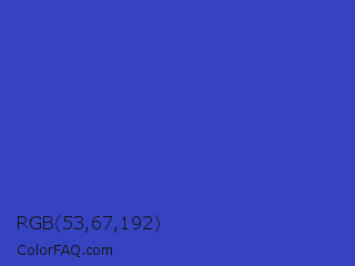 RGB 53,67,192 Color is a normal blue color and the nearest color is Violet Blue #324ab2. Hex code #3543c0 and RGB value is rgb(53,67,192). In RGB color space, this color is composed of 21% red, 26% green, 75% blue, In CMYK color space, this color is composed of 72% cyan, 65% magenta, 0% yellow , 25% black , In HSL color space, this color has a hue angle of 234° , 57% saturation and 48% lightness.