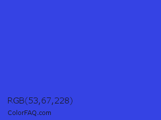 RGB 53,67,228 Color is a normal blue color and the nearest color is Palatinate Blue #273be2. Hex code #3543e4 and RGB value is rgb(53,67,228). In RGB color space, this color is composed of 21% red, 26% green, 89% blue, In CMYK color space, this color is composed of 77% cyan, 71% magenta, 0% yellow , 11% black , In HSL color space, this color has a hue angle of 235° , 76% saturation and 55% lightness.