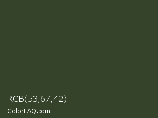 RGB 53,67,42 Color is a very dark green color and the nearest color is Kombu Green #354230. Hex code #35432a and RGB value is rgb(53,67,42). In RGB color space, this color is composed of 21% red, 26% green, 16% blue, In CMYK color space, this color is composed of 21% cyan, 0% magenta, 37% yellow , 74% black , In HSL color space, this color has a hue angle of 94° , 23% saturation and 21% lightness.