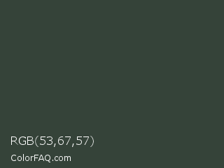 RGB 53,67,57 Color is a dark green color and the nearest color is Kombu Green #354230. Hex code #354339 and RGB value is rgb(53,67,57). In RGB color space, this color is composed of 21% red, 26% green, 22% blue, In CMYK color space, this color is composed of 21% cyan, 0% magenta, 15% yellow , 74% black , In HSL color space, this color has a hue angle of 137° , 12% saturation and 24% lightness.