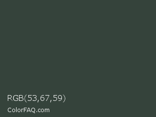 RGB 53,67,59 Color is a dark green color and the nearest color is Lunar Green #3c493a. Hex code #35433b and RGB value is rgb(53,67,59). In RGB color space, this color is composed of 21% red, 26% green, 23% blue, In CMYK color space, this color is composed of 21% cyan, 0% magenta, 12% yellow , 74% black , In HSL color space, this color has a hue angle of 146° , 12% saturation and 24% lightness.