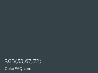 RGB 53,67,72 Color is a dark blue color and the nearest color is Arsenic #3b444b. Hex code #354348 and RGB value is rgb(53,67,72). In RGB color space, this color is composed of 21% red, 26% green, 28% blue, In CMYK color space, this color is composed of 26% cyan, 7% magenta, 0% yellow , 72% black , In HSL color space, this color has a hue angle of 196° , 15% saturation and 25% lightness.