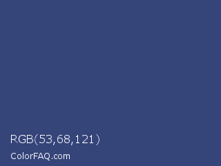 RGB 53,68,121 Color is a normal blue color and the nearest color is East Bay #414c7d. Hex code #354479 and RGB value is rgb(53,68,121). In RGB color space, this color is composed of 21% red, 27% green, 47% blue, In CMYK color space, this color is composed of 56% cyan, 44% magenta, 0% yellow , 53% black , In HSL color space, this color has a hue angle of 227° , 39% saturation and 34% lightness.