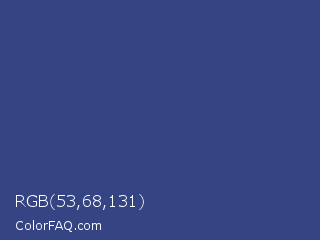 RGB 53,68,131 Color is a normal blue color and the nearest color is Chambray #354e8c. Hex code #354483 and RGB value is rgb(53,68,131). In RGB color space, this color is composed of 21% red, 27% green, 51% blue, In CMYK color space, this color is composed of 60% cyan, 48% magenta, 0% yellow , 49% black , In HSL color space, this color has a hue angle of 228° , 42% saturation and 36% lightness.
