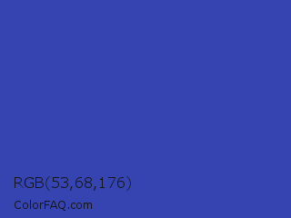 RGB 53,68,176 Color is a normal blue color and the nearest color is Violet Blue #324ab2. Hex code #3544b0 and RGB value is rgb(53,68,176). In RGB color space, this color is composed of 21% red, 27% green, 69% blue, In CMYK color space, this color is composed of 70% cyan, 61% magenta, 0% yellow , 31% black , In HSL color space, this color has a hue angle of 233° , 54% saturation and 45% lightness.