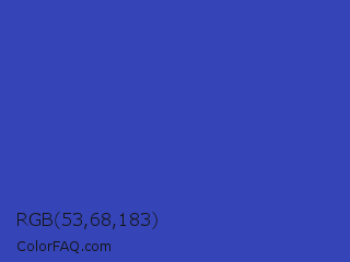 RGB 53,68,183 Color is a normal blue color and the nearest color is Violet Blue #324ab2. Hex code #3544b7 and RGB value is rgb(53,68,183). In RGB color space, this color is composed of 21% red, 27% green, 72% blue, In CMYK color space, this color is composed of 71% cyan, 63% magenta, 0% yellow , 28% black , In HSL color space, this color has a hue angle of 233° , 55% saturation and 46% lightness.