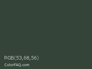 RGB 53,68,56 Color is a dark green color and the nearest color is Kombu Green #354230. Hex code #354438 and RGB value is rgb(53,68,56). In RGB color space, this color is composed of 21% red, 27% green, 22% blue, In CMYK color space, this color is composed of 22% cyan, 0% magenta, 18% yellow , 73% black , In HSL color space, this color has a hue angle of 132° , 12% saturation and 24% lightness.