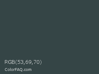 RGB 53,69,70 Color is a dark cyan color and the nearest color is Cape Cod #3c4443. Hex code #354546 and RGB value is rgb(53,69,70). In RGB color space, this color is composed of 21% red, 27% green, 27% blue, In CMYK color space, this color is composed of 24% cyan, 1% magenta, 0% yellow , 73% black , In HSL color space, this color has a hue angle of 184° , 14% saturation and 24% lightness.