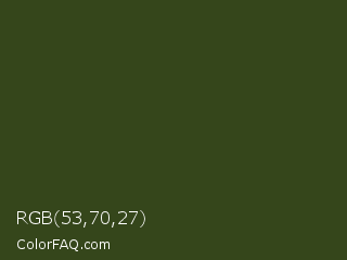 RGB 53,70,27 Color is a very dark green color and the nearest color is Clover #384910. Hex code #35461b and RGB value is rgb(53,70,27). In RGB color space, this color is composed of 21% red, 27% green, 11% blue, In CMYK color space, this color is composed of 24% cyan, 0% magenta, 61% yellow , 73% black , In HSL color space, this color has a hue angle of 84° , 44% saturation and 19% lightness.