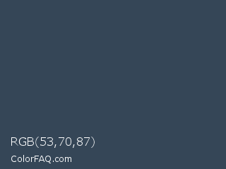 RGB 53,70,87 Color is a dark blue color and the nearest color is Oxford Blue #384555. Hex code #354657 and RGB value is rgb(53,70,87). In RGB color space, this color is composed of 21% red, 27% green, 34% blue, In CMYK color space, this color is composed of 39% cyan, 20% magenta, 0% yellow , 66% black , In HSL color space, this color has a hue angle of 210° , 24% saturation and 27% lightness.