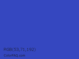 RGB 53,71,192 Color is a normal blue color and the nearest color is Violet Blue #324ab2. Hex code #3547c0 and RGB value is rgb(53,71,192). In RGB color space, this color is composed of 21% red, 28% green, 75% blue, In CMYK color space, this color is composed of 72% cyan, 63% magenta, 0% yellow , 25% black , In HSL color space, this color has a hue angle of 232° , 57% saturation and 48% lightness.